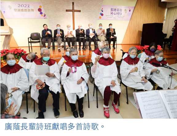 香港華人基督教聯會廣蔭頤養院(綜合安老服務)已於12月11日,在該院禮堂舉行「聖誕感恩崇拜2023」,今年主題為「結連基督.同心同行」,聯會執董、慈惠部委員、頤養院長者及家屬出席崇拜,一同歡度聖誕,歌頌耶穌基督降生。