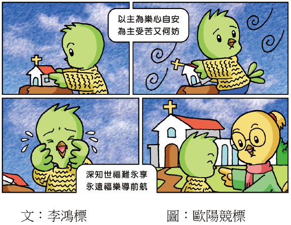 感謝上帝,在受苦的時候,信靠上帝的人不僅能「以主為樂心自安」,如先知哈巴谷所言:「雖然無花果樹不發旺,⋯⋯田地不出糧食,圈中絕了羊⋯⋯;然而,我要因耶和華歡欣,因救我的上帝喜樂。主耶和華是我的力量;他使我的腳快如母鹿的蹄,又使我穩行在高處。」(哈三17-19)並且我們還有「苦楚終必過去」的盼望。正如世上沒有長存的福樂,人世間的苦痛也終必過去!