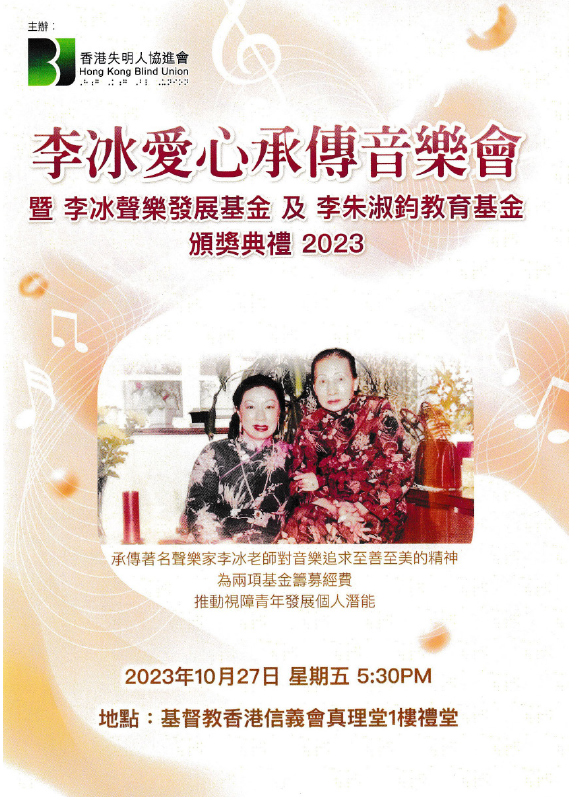 是次音樂會,一方面是紀念李冰老師離世11週年,同時也是成立李冰聲樂發展基金及李朱淑鈞教育基金 10週年,我們看見一眾李冰老師的門生以實際行動去實踐基督的信望愛,籌辦音樂會為的是延續基金的工作,讓更多視障的年輕人能在學術上或音樂上得到幫助,並提升他們的終身才能,與他們一起成長與同行。