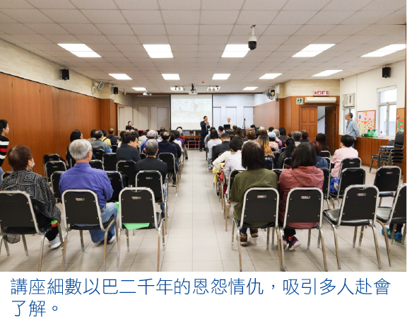 以巴衝突非今日之事,而是早於二千年前積下難解之結。宏恩基督教學院主辦「以巴風雲」神學講座已於去年12月9日舉行,由該院基督教事工學院學術顧問、加拿大恩道華人神學院前院長楊慶球牧師細數以巴二千年的恩怨情仇 。