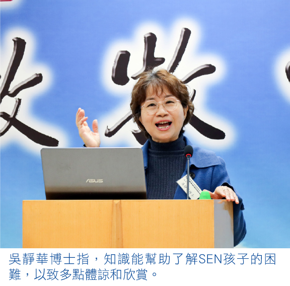 吳博士建議父母嘗試用孩子的角度去看世界,並作孩子的「樹洞」,辨識孩子的情緒,教導他們一些情況詞彙,以表達情緒。同時,父母需要持守規則,讓他們知按規矩並跟從,也提供選擇給孩子,讓他們學習承擔選擇的後果。她提醒,要有耐性和包容等候他們成長,確信他們的恩賜和能力,「知識幫助我們去了解SEN孩子的特徵和困難,多一些體諒,以看見上帝在SEN孩子生命上所創造的美好。」