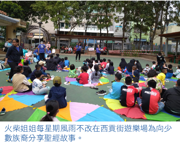 在西貢街遊樂場裏,一羣少數族裔的小孩在你追我逐。從事兒童教育工作的「火柴姐姐」見狀走進公園,打開彩虹傘鋪在地上,翻開書本講起故事來,如是者每週一次,聚過來的人愈來愈多,逐漸成為今日的香港新生命教會(New Life Church Hong Kong)。
