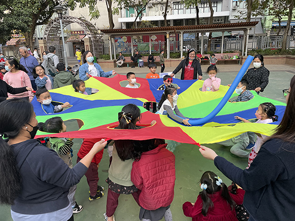 香港新生命教會堂主任楊芷嫣牧師(下稱「火柴姐姐」)分享,2014年社會氛圍低落時,沈重的無力感令她反思信仰。在一次行區祈禱中,遇上了西貢街遊樂場一班少數族裔的小孩,在母會弟兄姊妹鼓勵下,她跳出教會踐行真道,開始服侍之路,亦在神學上作更多裝備。她憶說,「最初就只有四、五個尼泊爾小孩,來的人愈來愈多,漸漸有義工來幫忙。」自此,那張彩虹傘風雨不改地每週鋪在地上,打風下雨就一起赤腳玩水;疫情來襲,就換成一張張細小的彩虹傘,四個一組分隔開來坐。