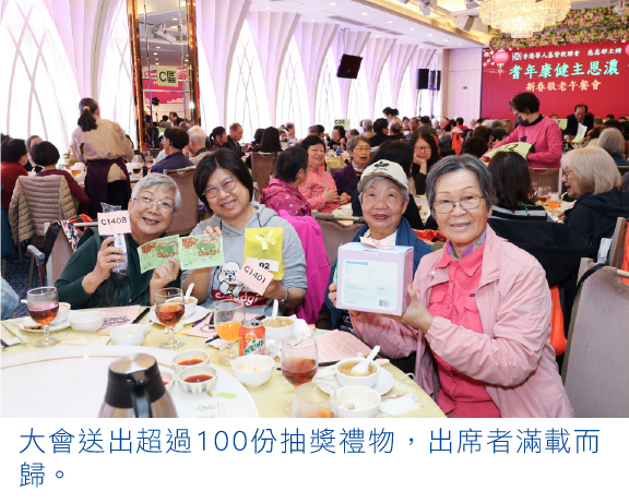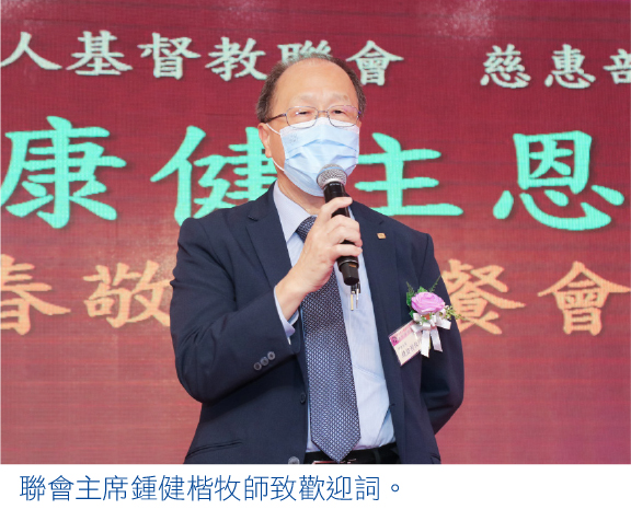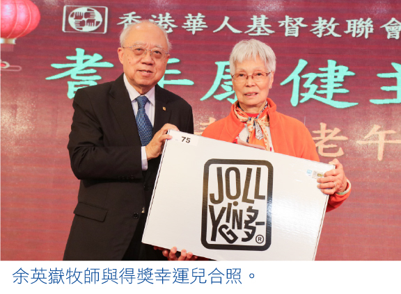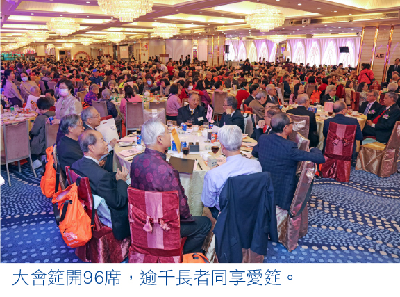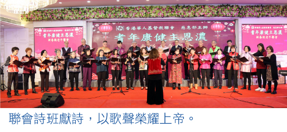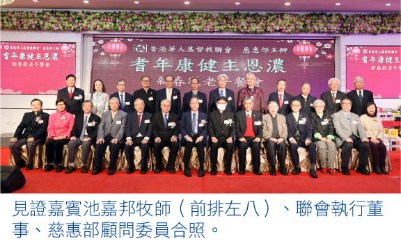 香港華人基督教聯會慈惠部主辦一年一度的「新春敬老午餐會」,已於2月17日假富臨皇宮(石門店)筵開96席,逾千位長者及親友們參加,同慶新春。今年午餐會主題為「耆年康健主恩濃」,寄意「龍」年蒙恩,由香港聖公會西九龍教區總幹事暨諸聖座堂堂牧池嘉邦牧師分享見證,提醒人雖然無法掌握人生,但上帝的恩典夠用,只要倚靠祂定會得着平安喜樂。