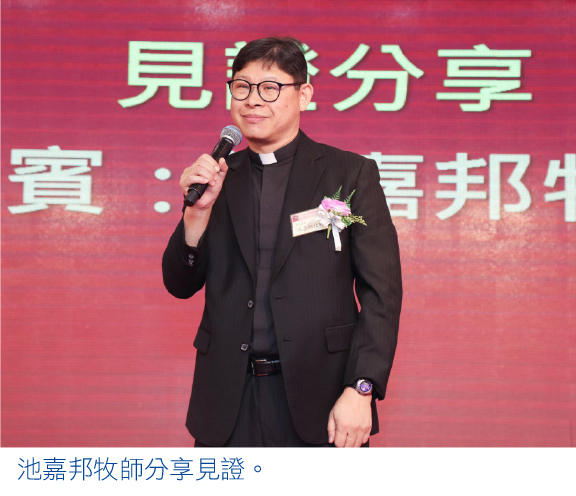 池嘉邦牧師擔任見證嘉賓,分享他17年前曾患重病的經歷。池牧師表示,當時他眼睛常看見重影,有時更模糊不清,初時以為只是工作疲勞,所以沒多加理會。直到一次在教會中暈倒,口吐白沫,全身抽搐,甚至有數分鐘呼吸停頓,幸好有醫護背景的弟兄姊妹在場急救,並及時送往醫院才撿回性命。