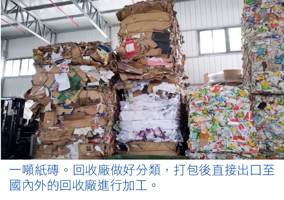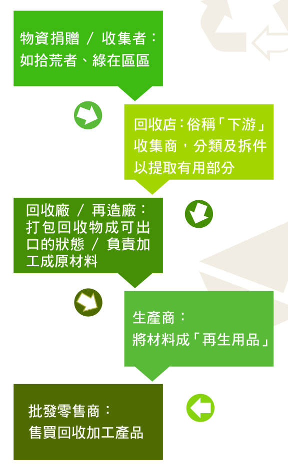 先說環保產業鏈的第一層,收集者。街上的拾荒者長久以來默默為我城減少垃圾,增加資源回收比例。我們可直接送他們手上已分類的回收品,甚至向他們購買二手紙箱,讓他們換取經濟所需,尊重以勞動養活自己的選擇,亦是關愛鄰舍的表現,彰顯基督愛心。也有政府招標營運的綠在區區,受政府監察,使回收物不被送往堆填區。近年有公司收費上門回收,減省物主處理回收品的時間成本,開拓新的商機。
