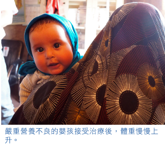 一個哭個不停的嬰孩掙扎着,護士要替他磅重,是5.5公斤。「這孩子情況好轉了,上個月只有4.5公斤,嚴重營養不良,他已七個月大了……我們給她媽媽高蛋白質高營養花生糊餵他吃,進展不錯,他今次應該能活過來。」護士面露笑容,把嬰孩交回給母親。