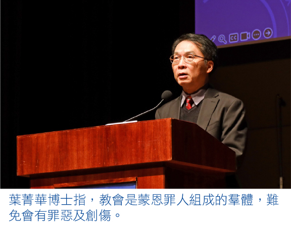 最後一晚講題為「聖徒羣體與罪人羣體」,葉菁華博士開宗明義指,教會既是上帝的組織,同時亦是人的組織。教會的「神性」在於信徒是上帝的子民,被上帝的道呼召出來宣揚上帝;教會是基督的身體,藉水禮歸入,也藉分享聖餐重新展現教會特質;整個教會羣體都是聖靈的居所,聖靈充滿令教會得以誕生。