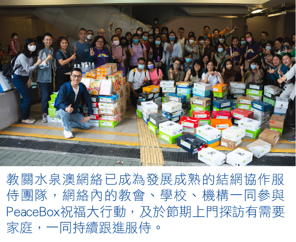 教關持續網絡教會一同協作服侍社區,舉行不同交流平台、牧者退修、基層事工工作小組、地區網絡……等等,促進教會之間彼此同行,在幻變的世代中,有同心合意地實踐使命的好伙伴,互相學習及支持。當中又透過不同先導計畫連結社區不同單位合作服侍社區,如自2014年起舉辦的PeaceBox祝福大行動,由慈善團體、商業機構及教會聯合主辦,藉着復活節提倡愛與關懷的訊息,透過收集小禮物將關愛送給基層,讓他們感受人間有情,互助關懷的幸福。過去11年來累計派發超過10萬個PeaceBox物資禮物盒,祝福了總數超過三十萬位受惠基層社區人士,亦讓我們看見基督徒羣體服侍的心志有所增長。