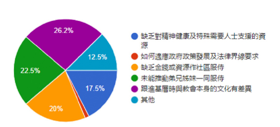 香港教會要經歷轉化增長,首先要了解於實踐社區服侍時遇上的困難及需要。教關在今年一至二月發問卷給予全港18區的伙伴教會,並統計126份由堂會牧長、長執、信徒領袖的回覆後得出結論,看見牧者領袖對實踐社區服侍比較傾向對「使命」及「領袖」的訓練需求殷切,其次是資源及人力上的配合(如物資、義工及空間地方),故此教關將舉辦課程幫助教會回應堂會與有需要人士之間存在文化差異,聆聽教會開展社區服侍過程中的掙扎及挑戰,實際地了解地區服侍及如何協調。以下圖表為香港教會回應「於實踐社區服侍時所遇到的困難是甚麼?」