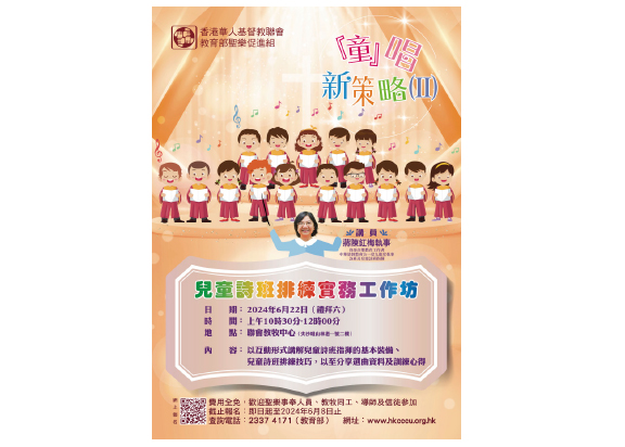 香港華人基督教聯會教育部聖樂促進組將於6月22日(禮拜六)上午10時30分至12時,於聯會教牧中心(尖沙嘴山林道1號2樓)舉辦「『童』唱新策略(II)——兒童詩班排練實務工作坊」,講員為資深音樂教育工作者、中華基督教會合一堂九龍堂執事蔣陳紅梅執事。內容:以互動形式講解兒童詩班指揮的基本裝備丶兒童詩班排練技巧,以至分享選曲資料及訓練心得。費用全免,對象為聖樂事奉人員、教牧同工、導師及信徒,報名日期由即日起至6月8日。網上報名:https://forms.gle/XdecvmQs9Rdh47Co8,詳情可瀏覽:www.hkcccu.org.hk,查詢可電2337-4171(教育部)。