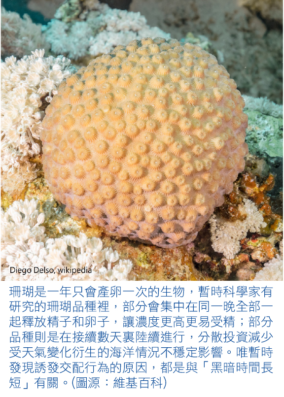 固定位置生長的珊瑚,即使無法移動求偶,沒眼沒耳的牠們卻懂得在相近的時間,如感應滿月後的日落後的黑暗時間,時數足夠就一同釋放大量精子和卵子到海裏進行受精,猶如相約好。還有發放化學訊息如荷爾蒙來通知同類「我準備好交配了」,真是用盡諸般方法來成就上主的祝福啊!