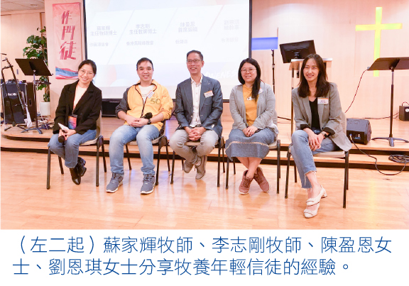 沙田浸信會主任牧師蘇家輝牧師開宗明義指出,教會面對年輕一代的挑戰時,需要思考如何轉型。他強調,社會運動和疫情已導致許多年輕人流失,教會與年輕人須建立合作關係,而非單方面的指導,例如鼓勵年輕人參與教會各項事工和決策等。他解釋,年輕人在合作過程中,感受到教會重視其參與和貢獻,同時能增進與教會領導者和其他成員的互動,更可從錯誤中學習,將「失敗」轉化為學習和成長的機會。因此他直言,教會需接納年輕人的創意思維,創造一個「安全」的環境,讓他們能勇敢地嘗試新事物,並以門徒訓練塑造未來領導者。他重申,教會應給予年輕人機會、空間和同行的支持,透過分享經驗和合作,培育出具有創意和責任感的新一代領袖,並與他們攜手同行面對當代挑戰。