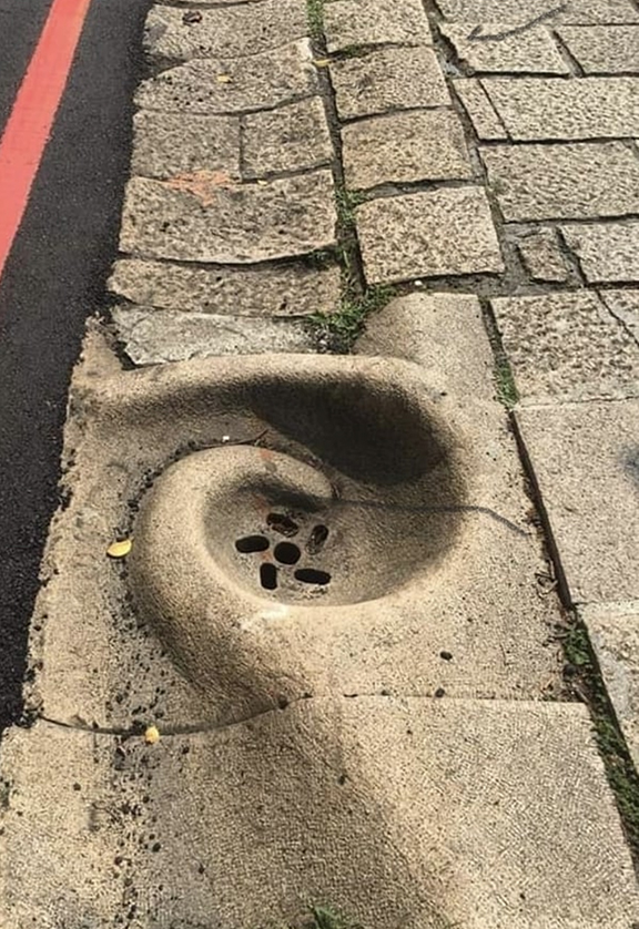 最近看到一家台灣室內裝修公司發帖,稱讚台北北投溫泉路的邊溝排水系統做得好,圖片顯示那是個螺旋型的集水渠口,樣子十足大螺頭。發帖人認為在斜坡上,要把雨水引到路邊水溝有難度,而圖中設計就把柏油路做高點,讓水往兩邊低處流,再利用螺旋狀渠道引水,就可以快速疏水。