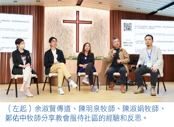 今天,教會恆常事工包括愛心飯券、派發物資、基層兒童及家長小組、與外間機構合作、探訪劏房戶家庭等。他特別提到,教會積極與坊間機構合作,例如有機構預備物資贈予有需要人士,教會則開放停車場擺放及派發物資,除了方便一眾街坊,也藉社關事工結連不同年齡的信徒,彼此學習服侍。他強調,這些事工其實並非教會資源,但卻因與機構合作,有機會接觸更多服侍對象,向他們分享福音訊息。因此他鼓勵眾牧者,教會開展社關不一定需要很大的聚會空間,只要認清教會強項並加以發揮,定能有效服侍社區。