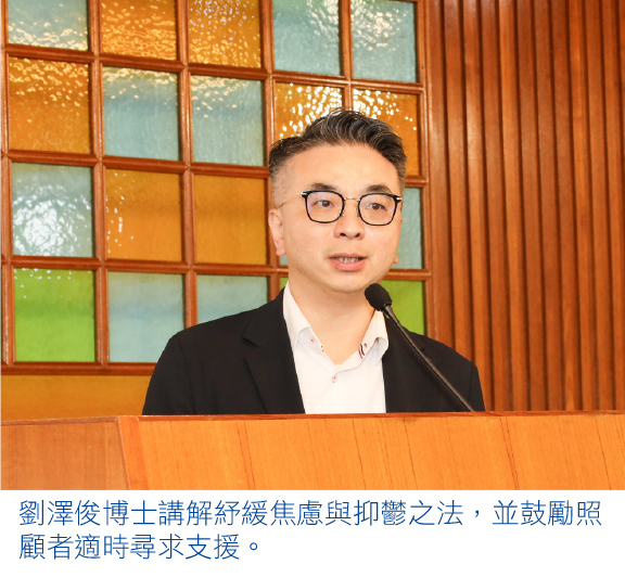香港華人基督教聯會已於6月1日,在聯會禮堂舉辦「心悠旅程──讓你解開心結.面對抑鬱與焦慮人士」專題講座。雅麗氏何妙齡那打素醫院及大埔醫院高級臨床心理學家劉澤俊博士表示,焦慮與抑鬱嚴重影響患者身心健康,建議可透過不同方式改善負面情緒,並提醒照顧者要正視自己的壓力,適時尋求幫助。
