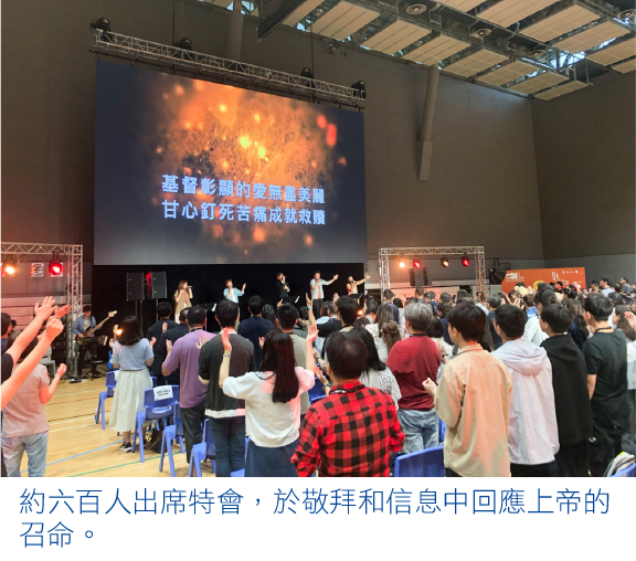 余博士遂指,《民數記》八章一至二節巧妙地夾附了「燈臺」的內容,「……『點燈的時候,七盞燈都要向燈臺前面發光。』」光燃亮之時,照向四方八面,經文卻強調照向前方的12塊陳設餅,象徵12支派,特要提醒以色列民——上帝必然光照、祝福他們,正如往昔一樣,此亦為上帝所立之應許。接着,余博士分享有關宣教士多多和穆斯林難民小沙的故事,因着禱告和信心的擺上,二人深切經歷上帝豐足的供應。不但使小沙成為福音的果子,更成了多多在事奉上的夥伴,於短短五年間,共同領了四代穆斯林信徒歸主。「面對艱難的世代,我們感到無力,卻也不至於那麼無力。」最後,余博士以詩歌作結,帶領會眾反思在此世代中,如何持守純淨的心,為主作奉獻。盼望信徒樂意盡心擺上,以致能看見更美、更大、超乎我們所想所求的祝福。