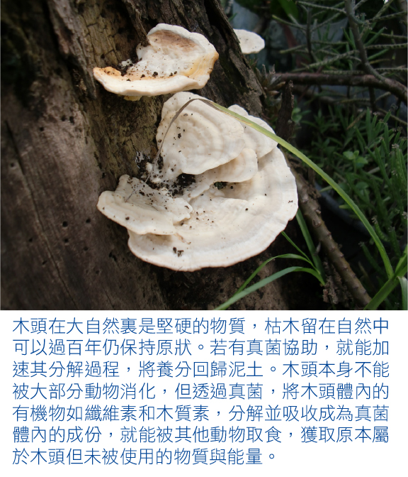 是誰讓這些簡單的單細胞細菌肩負如此重要的角色?別忘了我們體內也住着無數細菌協助我們消化食物!有些真菌尚有佳美容顏,更多的分解者披着黯淡的衣裳在自然裏默默地工作;看似敗壞的腐爛過程,卻是生命萌發所需養分的必要一環,成就上主讓萬物豐盛生長的美意。上主看事物的角度,值得我們細味學習。