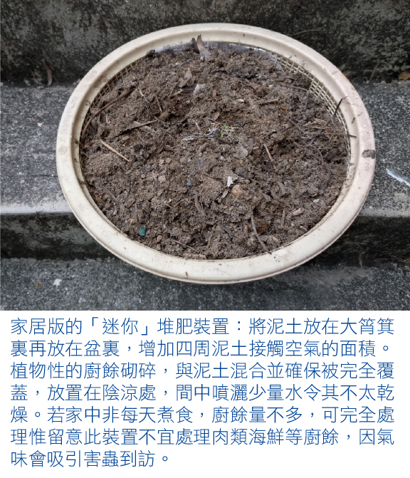 若在鄉郊居住,附近已有農田,不妨詢問田主會否做廚餘堆肥。將家中廚餘送到最近的農田,用天然的方法分解,既將運輸衍生的碳排放減至最低,也不耗用額外能源去製作堆肥,是對地球和我們的土地更佳的選項。