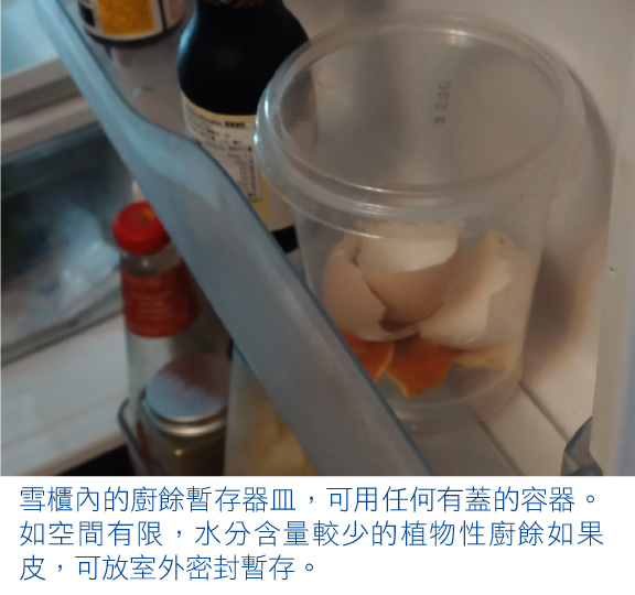 3. 低溫:若能即日清理的廚餘,只須暫放在陰涼地方便可。若要存放超過一天,放在雪櫃內能減慢細菌令廚餘腐化的速度,減少氣味產生。