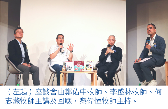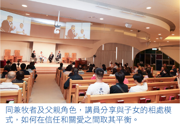 中國基督教播道會同福堂創堂牧師何志滌牧師分享其女兒在事奉上的學習,他提及應放手讓孩子按自己的信仰步伐成長,接受其屬靈生命亦需要被塑造,讓她在成長過程中「做自己」。宏恩基督教學院特約教授李盛林牧師同樣認為,與孩子同行是作為父親最重要的學習,而真正的同行,需要給予空間和自由。他憶述,小兒於大學畢業前兩至三個月,毅然放棄學位選擇發展舞蹈事業。縱有失望,李牧師仍在禱告後學習放手,因深信一切在上帝手中,祂必預備。觀潮浸信會堂主任鄭佑中牧師回應道,孩子的成長需要愛與恩典,不應只從現存標準衡量子女的價值。他提及《聖經》以「慈繩愛索」形容上帝對以色列民的愛和牽引(何十一4),又引述保羅所言:「我栽種了,亞波羅澆灌了,惟有上帝叫他生長。」(林前三6),盼作父母的,可將目光放遠,憑信把生命交託,以致能適切地導引、適時地放手。