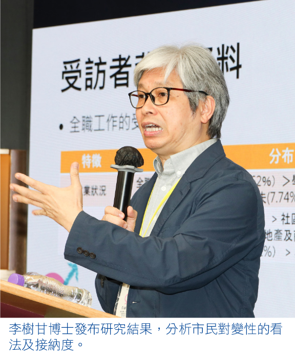 至於,受訪者對跨性別人士在不同工作場所、專業領域及社會環境的接納程度方面,受訪者最不接受未完成變性手術人士,進入另一性別的洗手間及參加另一性別與體能相關的運動;相反,受訪者相對接受已完成手術人士,從事服務性、教育及家居服務等工作。他表示,從結果看出受訪者着重人權,但也會考慮私隱及公平原則,如未完成手術者進入另一性別的洗手間,有可能牽涉私隱和人身安全問題,以及參與體能運動比賽衍生的公平問題等。