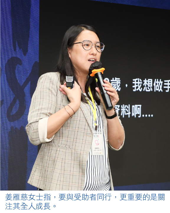 新造的人協會總幹事姜雁慈女士認為,需同理受助者的內心掙扎,確切理解受助者生活上的實際需要。她以C.A.R.E.的應用模式為主軸,從輔導的實際經驗分享如何連結人的生命。首先是自我檢視(Check),認識自身的限制,方能在禱告交託,學習與上帝同工;而接納(Acceptance)亦包括陪伴,讓對方經歷被愛;再者,與受助者反思(Reflection)生命的本質,與上主重新連結,有助其步向生命之重整;成長指標(Empowerment)則指向全人成長,於情緒管理、自我價值、健康界線及性別學習各範疇上,在上帝堅立下成長。她寄語同行者切勿簡化生命之複雜性,應宏觀地了解作為「人」個體的需要,而非只在於性傾向能否得以改變。
