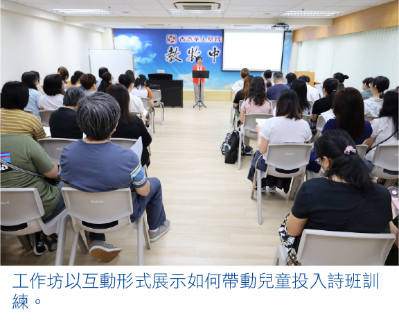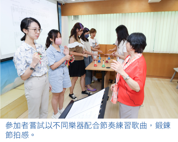 在訓練技巧方面,她提到以互動形式帶動兒童詩班員的學習氣氛。惟一般兒童的專注力較成年人低,建議練習維持在1.5小時內完成,同時需妥善管理秩序,在適當時以手勢或聲音等方式示意安靜,按需要安排小休或由導師帶領之放鬆活動,藉此提升小詩班員的學習效能。此外,她示範以唱遊形式進行音準訓練,用附有音階之不同短句或英語字詞等多元形式進行「音樂接龍」,同時讓詩班員掌握不同的音域。至於節奏方面,可嘗試以唸口訣鍛鍊孩子的節拍感,輔以拍手或變速等加強變化,使詩班員體驗音韻樂趣之餘,亦有助建立基本的樂理概念。