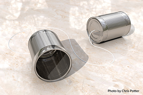 ▲「土電話」原理是以容器收集聲音的能量,轉化為容器的震動,藉繩子傳遞至另一容器,形成傳話工具。隨着無線電科技發展,電訊訊號不再受實體線路限制,只要身處訊號發射基站覆蓋的範圍,手機在移動中仍能接收訊號,持續通話。然而,這需要多次轉換訊號形式來完成。