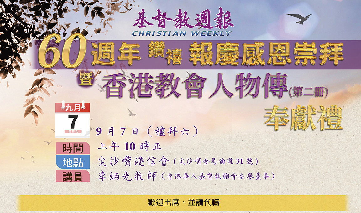 聯會出版部將於9月7日(禮拜六)上午10時正,假尖沙嘴浸信會(尖沙嘴金馬倫道31號)舉行「《基督教週報》六十週年(鑽禧)報慶感恩崇拜暨《香港教會人物傳》(第二冊)奉獻禮」。《香港教會人物傳》(第二冊)一書為報慶及配合聯會2025年創會一百一十週年紀念而特意出版,記錄香港教會歷代教牧同工及傑出信徒的佳美腳蹤,藉此追溯先賢行傳,見證上主宏恩。本書共分四大章,首章記錄了三十二位傳教士的故事;第二章記錄來自各宗派二十五位傳道先賢的貢獻;第三章分別挑選了教育、醫療、文字、社會服務界別的先賢;第四章收錄了二十一位傑出信徒。此巨著由李金強博士擔任主編,聯同十多位學者為百位教會先賢撰寫傳記,將於當日獻呈見證,及後公開發行。
