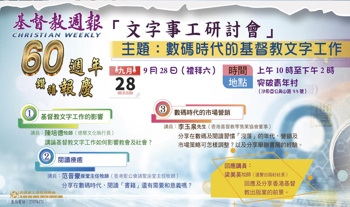回顧過去上帝的恩領,始得着前行的動力。《基督教週報》鑽禧報慶「文字事工研討會」將於9月28日(禮拜六),上午10時至下午2時,假突破青年村(沙田亞公角山路33號)舉行,主題為「數碼時代的基督教文字工作」。研討會講員及講題分別為:聖公會諸聖座堂主任牧師范晋豪主講「閱讀療癒」,分享閱讀實體及電子書籍的需要及意義;德慧文化執行長陳培德主講「基督教文字工作的影響」,講論基督教文字工作如何影響教會及社會;香港基督教零售業協會董事李玉泉主講「數碼時代的市場營銷」,分享營銷和市場策略,以及舉辦書展的經驗。最後由道聲出版社社長梁美英回應,分享香港基督教出版業的前景。