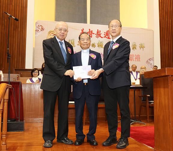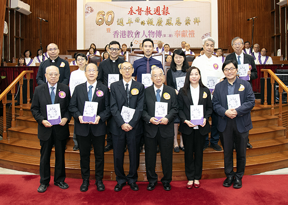 ▲李志剛牧師(前排右三)為奉獻禮祈禱,將《香港教會人物傳》(第二冊)呈獻上帝。