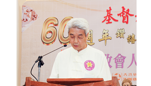 ▲鍾健楷牧師致謝及報告,感謝眾人出席報慶感恩崇拜。聯會主席(兼任總幹事)鍾健楷牧師報告,《基督教週報》走到今天已是一甲子的歲月,縱然時勢和人心在變,但上帝救贖恩典不變,因此《基督教週報》在不同年代都變革求新,目的就是承傳使命,傳揚福音。「『盛世一同宣揚基督真理,時窮並肩持守信仰』,今天的報慶感恩崇拜,不論是作者、讀者及所有人的參與,都是為主作見證。」
