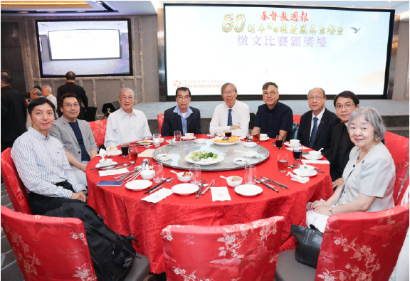 ▲(前排)聯會正副主席、徵文比賽評審和(後排)得獎者合照。感恩崇拜完結後,慶典接續移師至尖沙嘴彩福皇宴舉行感恩聚餐暨徵文比賽頒獎禮。吳思源先生致詞時分享,他年少時的學習成績並不理想,直至中三機緣巧合下參加徵文比賽而喜獲冠軍,此亦成了激勵他往後努力進步的動力,藉此勉勵與會者堅持寫作,分享生命;他亦表示參賽作品經眾評審細心批閱,形容得獎作品實至名歸,接着由聯會主席鍾健楷牧師及聯會副主席余英嶽牧師分別頒發獎牌予冠、亞、季軍及優異獎得主。最後,梁銘牧師帶領謝飯祝禱,他指《基督教週報》縱歷風雨,依舊無阻基督恩典的彰顯,當會眾一同共享午宴,亦為享受主內團契彼此連結的時刻。