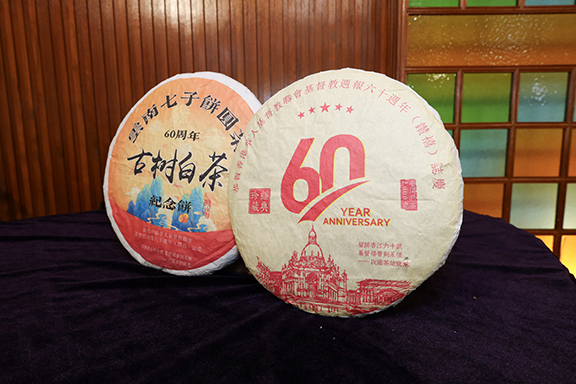 ▲黃承香牧師特為報慶致送兩個紀念茶餅,每個淨重兩公斤,份量十足。