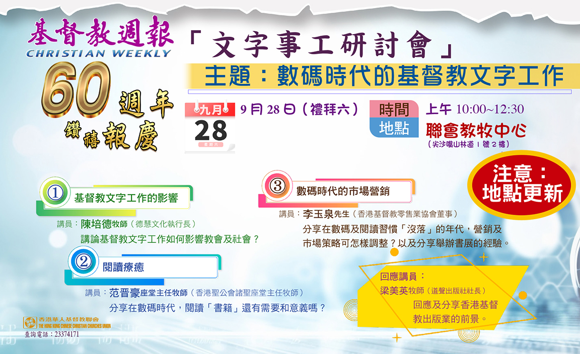 有見及此,適逢《基督教週報》60週年鑽禧報慶,本報將於9月28日(禮拜六),上午10時至中午12時30分,於聯會教牧中心(尖沙嘴山林道1號2樓)舉行「文字事工研討會」,邀請基督教出版界同業及對文字事工有抱負的人士共聚,探討數碼時代下,基督教文字工作的意義及前景。