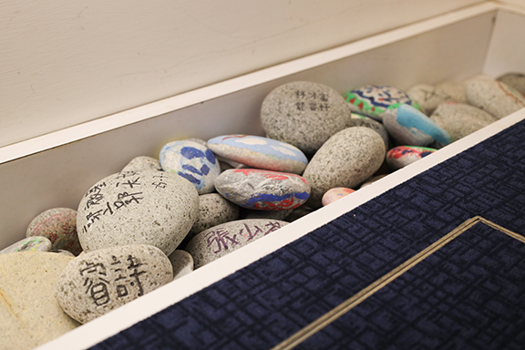 ▲禮堂台上擺放着寫上會友名字的石頭,喻意以色列人渡過約但河後立石為記。