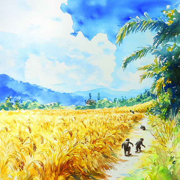 秋收季節,天空藍得透明,廣袤遼闊的後花園處處稻穗金黃一片海;隨山地阿嬤車子遊歷大山大水,四唯倍感心曠神怡覺得這兒是家,他們是歸人不是客旅!在獮猴出沒的路旁停駐,四人悄悄走近幾隻小猴蹲低身讓阿嬤拍照,小可愛也擺好姿勢歡然入鏡,然後回到兩乳垂垂的母猴身邊。「猴子不怕人?」「有媽媽在嘛!」「爸爸呢?」說時遲、那時快,一隻勃起鮮紅陰莖的猴王兇起一張臉走近妻兒,嚇得大弟不停撫胸。