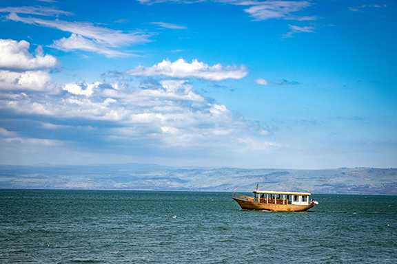 天朗氣清,風和日麗,觀光船駛離碼頭,走向海中,海另一邊有一列山丘,很安靜,像躺下的午睡老人,享受着溫暖的陽光。加利利海其實不是海,而是一個湖,淡水的,水源主要來自北面黑門山峯的溶雪。加利利海在海平面以下213公尺,是世界上最低的淡水湖,這湖泊不單風景美麗,更為加利利大小城鎮提供飲用水及漁穫海產。
