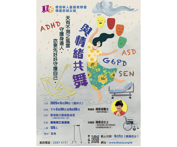 香港華人基督教聯會傳道部婦女組將於5月24日(禮拜六)下午2時30分,假香港聖公會諸聖座堂禮堂(旺角白布街11號)舉行「與情緒共舞——天有不測之風雲,守護身邊人,亦要先好好守護自己」講座。講員為精神科專科醫生陳嘉璐醫生、香港基督教女青年會長者及社區健康服務部總主任韓慕琼女士,對象為全港教牧同工及信徒,名額120名,額滿即止。報名可瀏覽聯會網站:https://www.hkcccu.org.hk,查詢可電2337-4171。