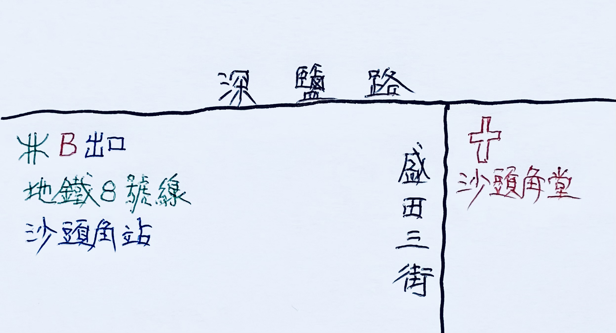 ▲深圳鹽田區「基督教沙頭角堂」交通位置略圖 (2025年5月繪製) ▲沙頭角堂是「樓上教會」,向街外多方竪立十架標記(2024年9月攝)。 ▲聚會時間。