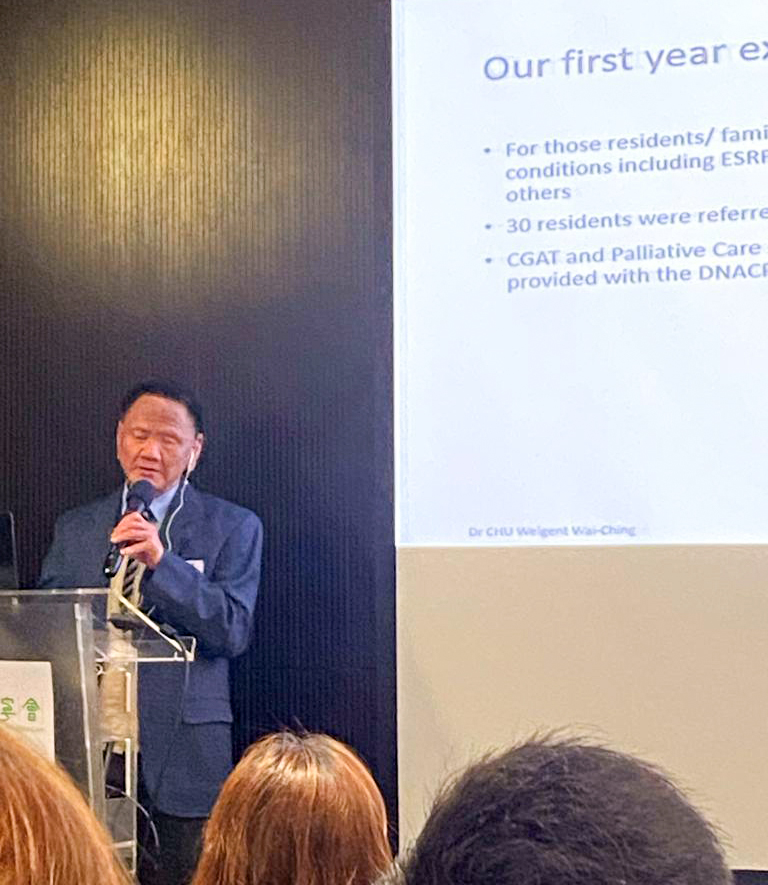 ▲伴隨淅瀝雨聲,朱偉正醫生(右)與好友吳思源先生娓娓道來他與手杖的故事。 ▲朱偉正醫生與護養院團隊發表有關長者合約院舍之晚期照顧的臨床研究和分析。(相片由受訪者提供)