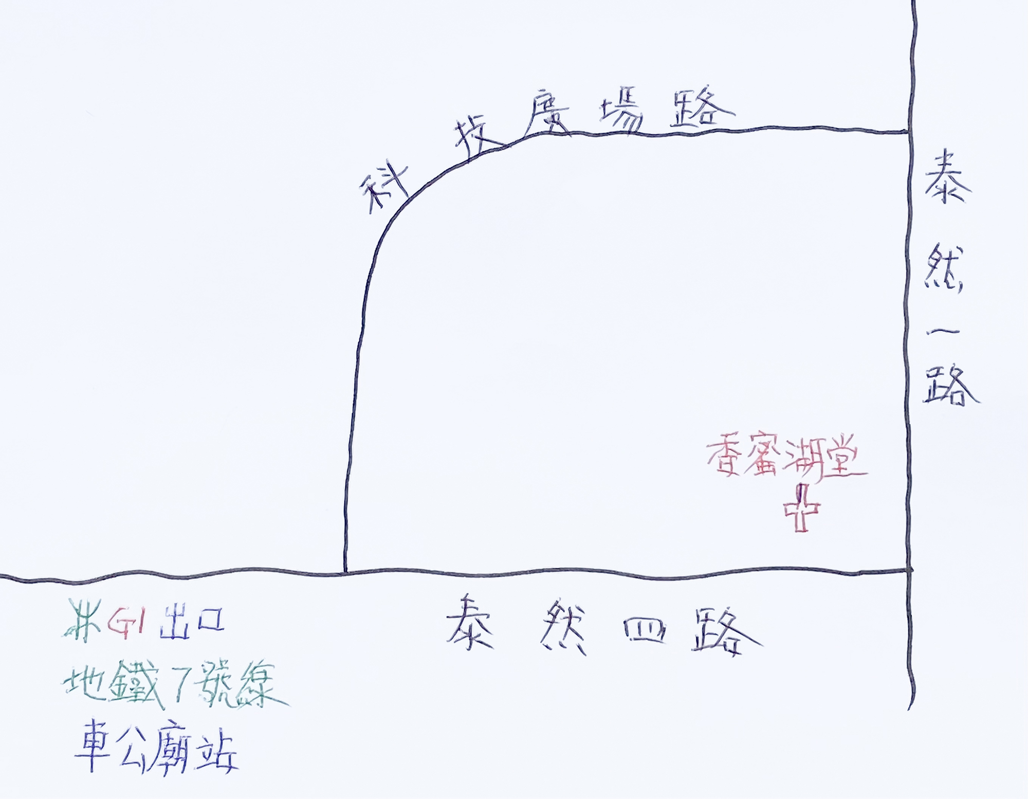 ▲香蜜湖堂是「商廈教會」; 禮堂一角牆上標記經句,右側見禮臺部分。(2024年9月攝) ▲香蜜湖堂聚會一覽; 設有英文團契。(2024年9月攝) ▲深圳福田區「基督教香蜜湖堂」交通位置略圖 (2025年6月繪製)