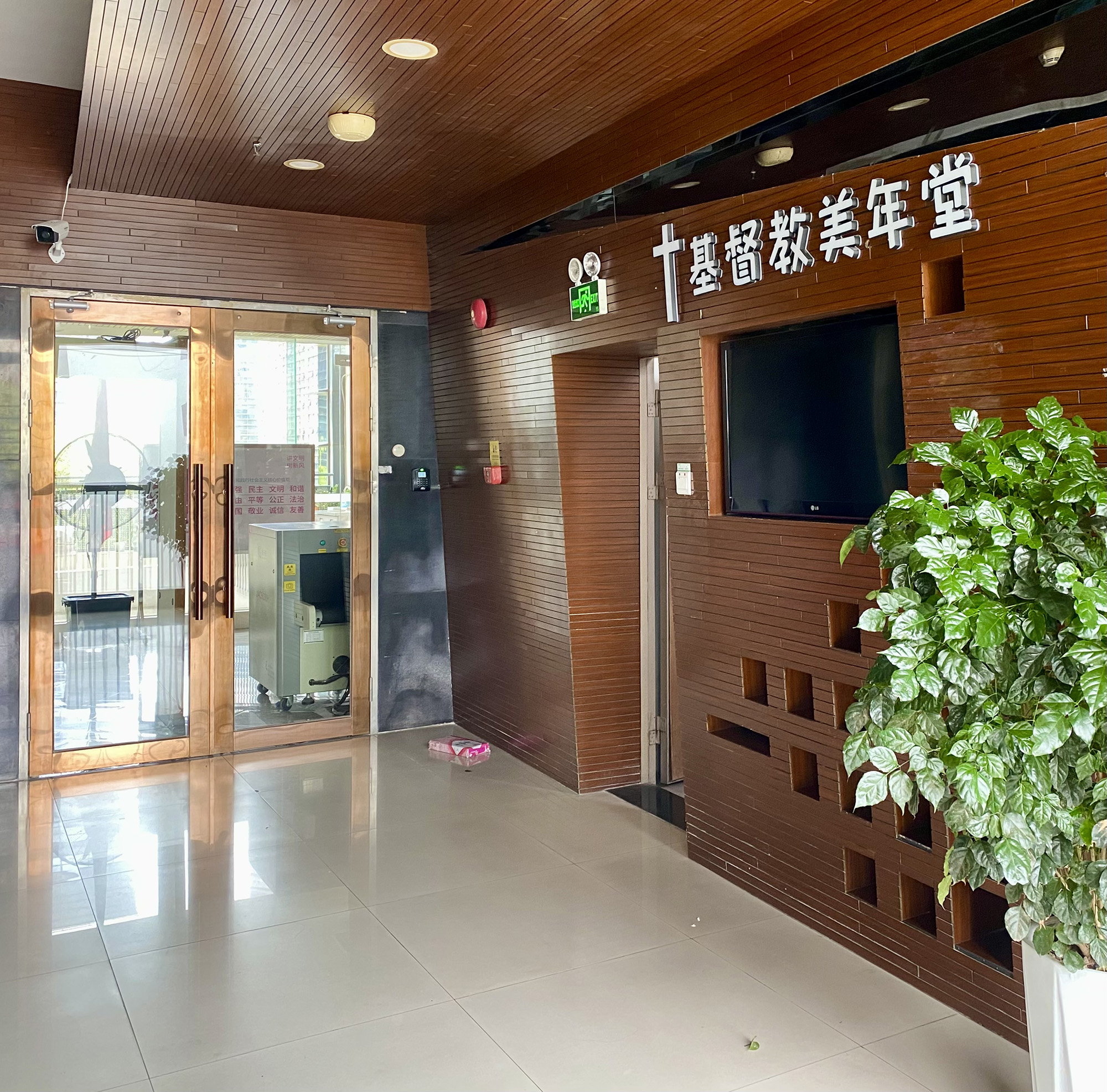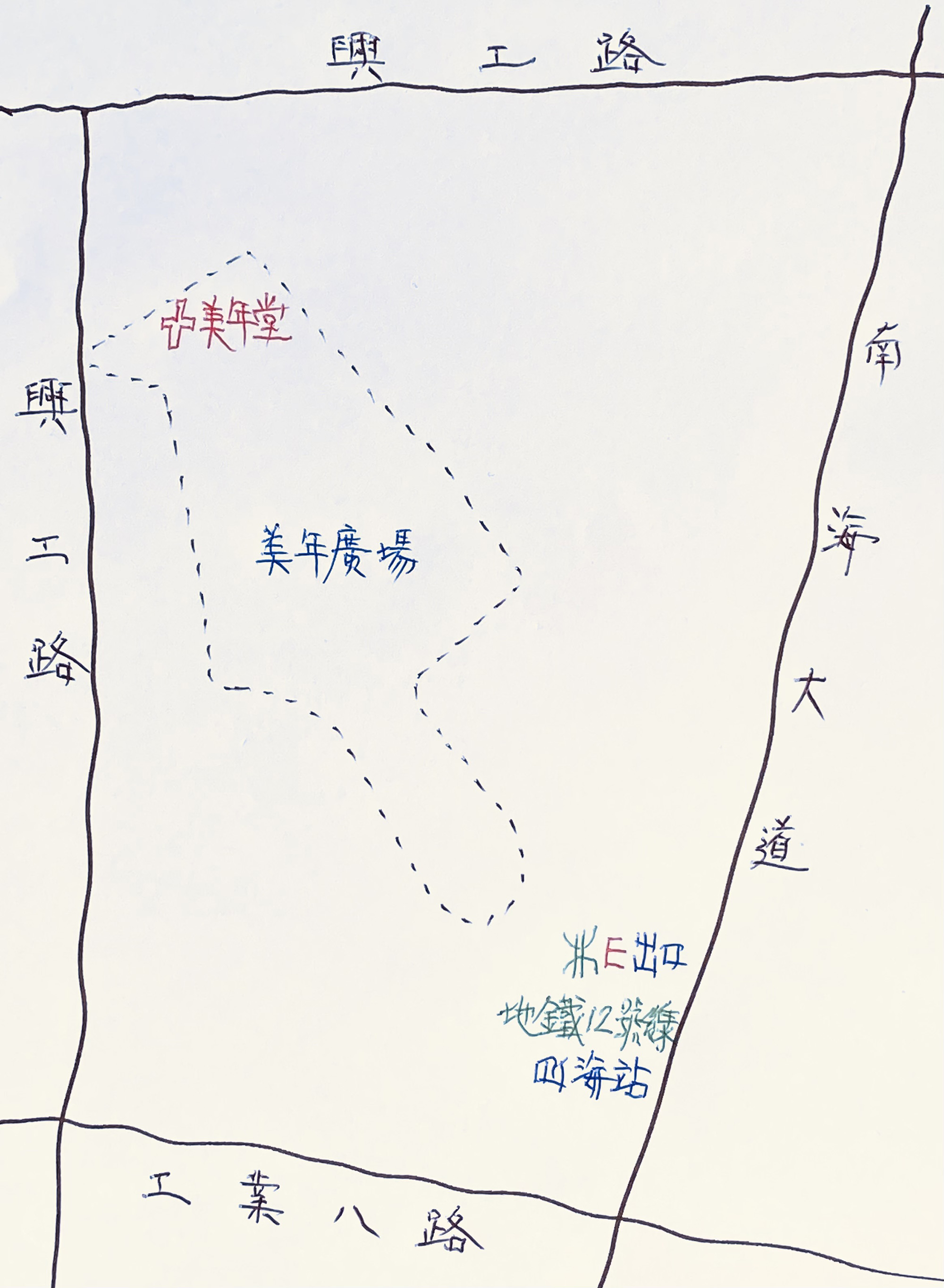 走上四海站E 出口地面,旁邊是南海大道;環繞這裏是一片高新住宅屋苑、及由多幢玻璃幕牆商廈構成的「美年廣場」。這片小區佈有密集的無名內街,依着本文附圖走,只需五分鐘步程,就來到一處相當曠闊的內園;在邊旁的商廈「第五棟」,可以找到「深圳市基督教美年堂」。