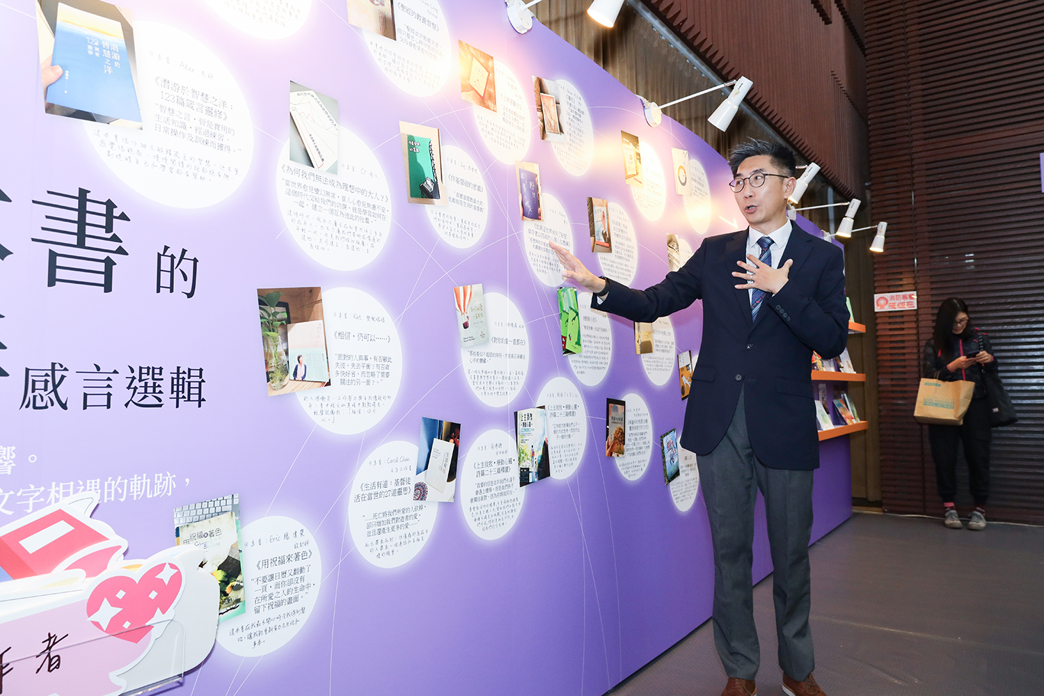 ▲馮肇熙社長介紹「一本書的陪伴」展示板,分享由讀者推薦對其別具意義的基督教書籍。
