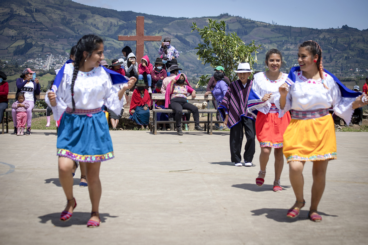 跟着是表演節目,一位年輕人彈着結他,帶領約10位少年人唱起原住民的民謠,「他們的歌是歌頌安第斯山的壯麗和厄瓜多爾家園的美好」,同事JB在耳邊解釋。有幾位穿著色彩鮮豔民族服飾的婦女起來跳舞,其他人一起擊掌打拍子,很快我們幾位訪客也被拉出去一起跳舞,大家都十分投入。