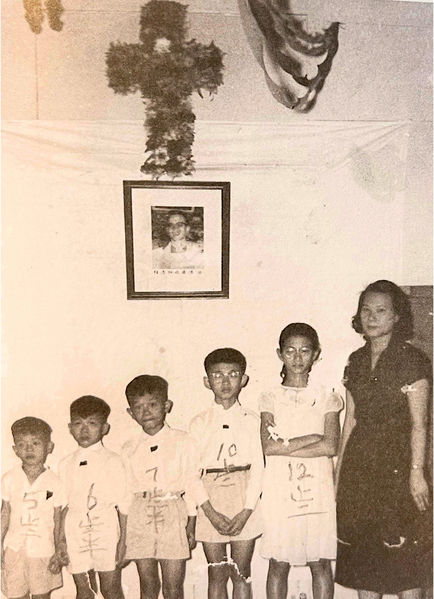 ▲涂牧師家人,攝於毛里裘斯之涂從芳牧師追思會(1959年6月17日),照片寫上各孩子年歲。