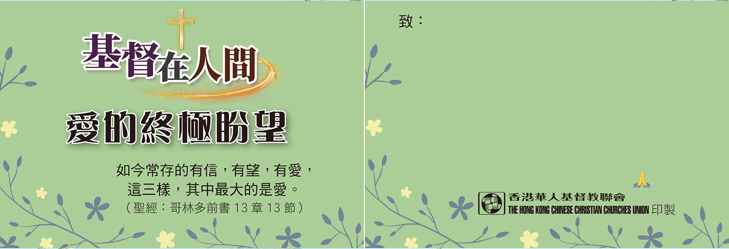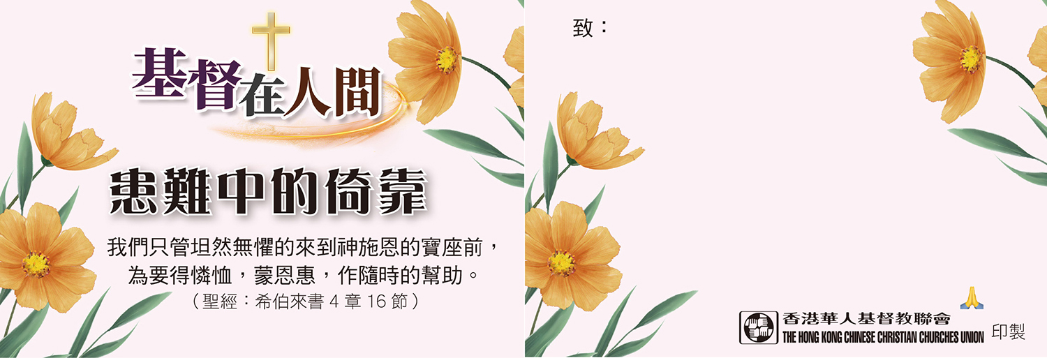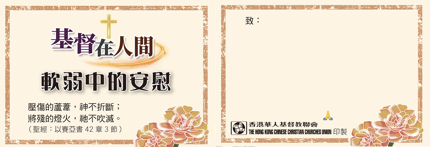 有見及此,香港華人基督教聯會特備心意咭、福音單張和易拉架等物資,透過聖經金句展現愛與安慰的信息,讓人在患難中看見從上帝而來的撫慰,向全港市民見證「基督在人間」。印刷製品可供堂會自由索取及派發,其中「基督在人間──我願與你同行」福音單張,亦會於全港分區聯合聖誕報佳音中派發,盼望市民明白聖誕的真諦──在最深沈的黑夜中,愛依然能發出光輝,以馬內利是不變的應許。