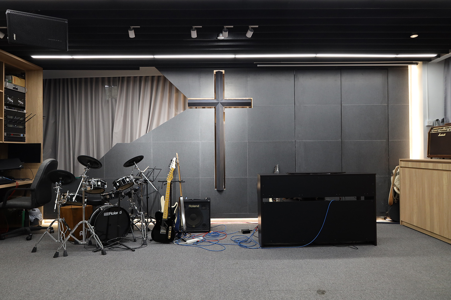 成功籌措資金購堂後,教會裝潢以黑色和木色為主調,聖壇前除了講台,還擺放了一部鋼琴和全套樂器,風格時尚活像一間錄音室。設計師還刻意在特色牆旁邊鑿開一處,視覺上剛好形成一斜路通往聖壇中央懸掛的十字架,既有信徒朝聖之意味,亦喻意人生方向正是朝向耶穌基督而行。