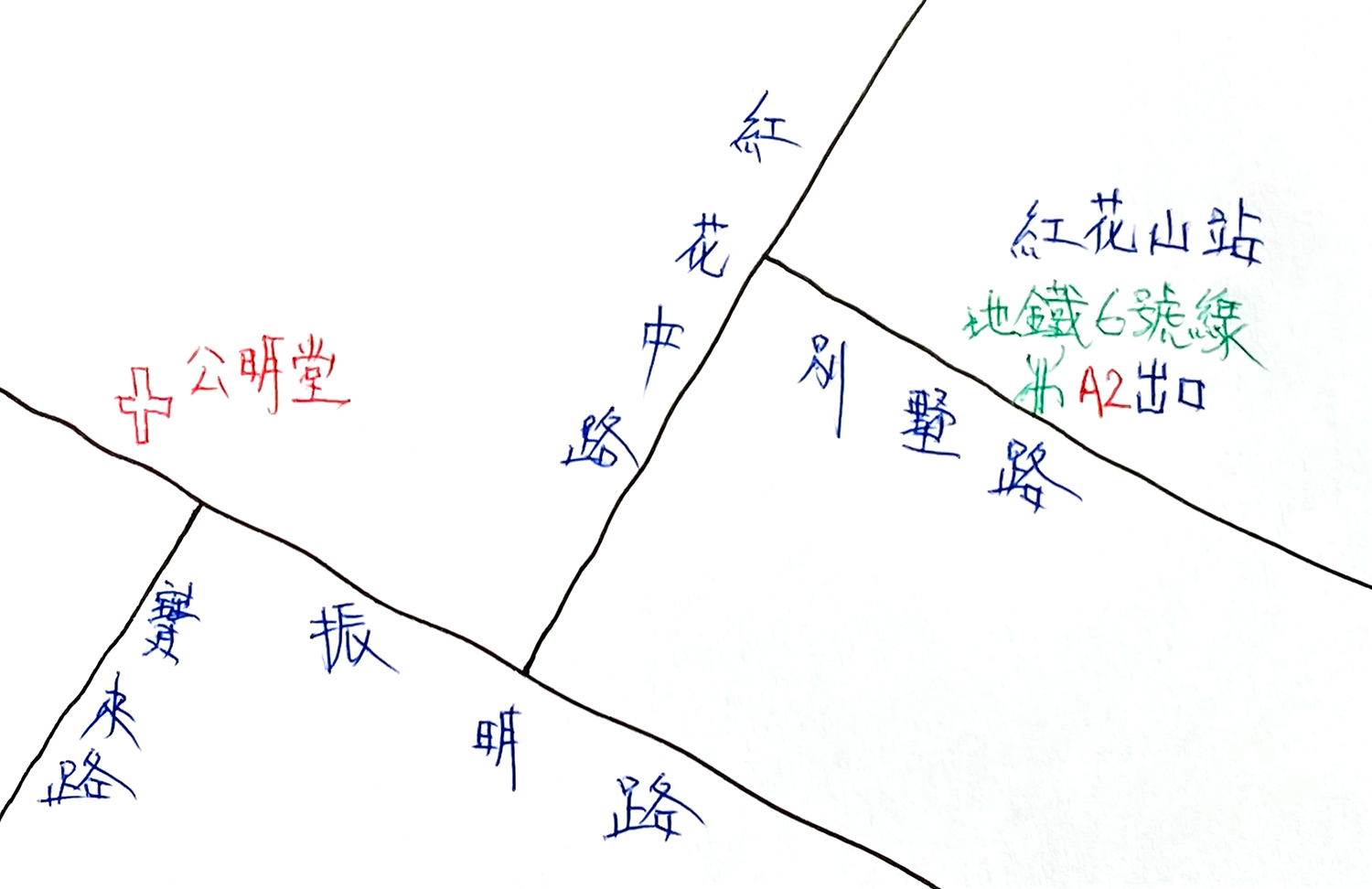 走上紅花山站 A2 出口,旁邊是別墅路;依着附圖所示的方位行走,轉兩個彎角就來到「深圳基督教公明堂」,大約是十五分鐘步程。這所堂會的日常通用名稱,堪稱百變。由所在的樓宇入口走上教會,一路見有「公明基督教」、「基督教公明教會」、「公明基督教會」等多種名稱。這大概是在堂會成長過程中的幾種口頭慣稱,一直留痕至今。
